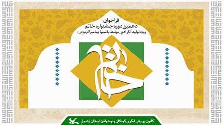 گفتنی است، بخش دانش‌آموزی دهمین دوره جشنواره خاتم با موضوع بازنمایی و بازگویی و بازآفرینی شخصیت و شیوه‌ی زندگی پیامبر اکرم (ص)، نمایش تأثیر وجوه شخصیت پیامبر اکرم (ص) در زندگی نزدیکان، اصحاب و معاصران ایشان و آفرینش ابعاد و نحوه آشنایی و الفت با زندگی پیامبر در دیدگاه و زندگی دیگران در طول تاریخ تا امروز در دو بخش داستان کوتاه در حداکثر پنج هزار کلمه و داستان کوتاهِ کوتاه (داستانک، داستان کوچک، داستانِ مینیمال) در حداکثر صد کلمه برگزار می‌شود.
