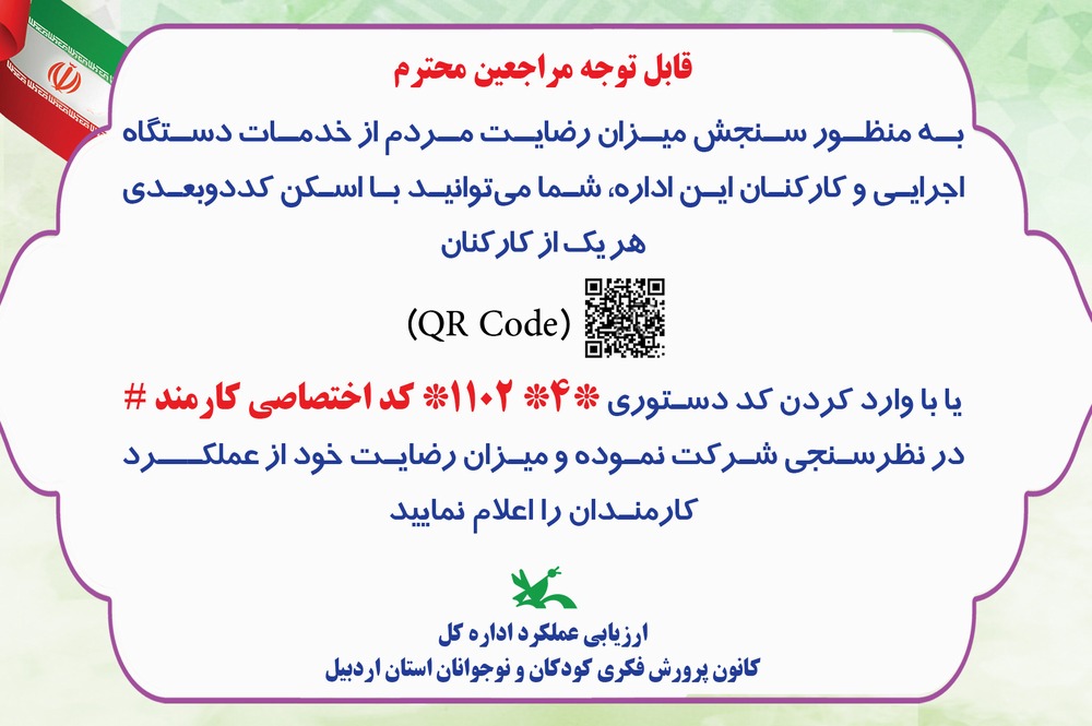 یکی از هدف‌های اصلی هر سازمان، جلب رضایت مشتریان و ارباب‌رجوع از طریق ارائه خدمات باکیفیت مطلوب است. در نظام اداری و اجرایی رضایت مردم از خدمات دستگاه‌های دولتی یکی از شاخصه‌ای اصلی سنجش کارآمدی و رشد و توسعه است و مؤلفه‌هایی از قبیل سرعت، صحت و دقت در انجام کار مراجعین، چگونگی رفتار و برخورد با ارباب‌رجوع و اطلاع‌رسانی مناسب عواملی هستند که موجب رضایتمندی مراجعین می‌شوند. به همین جهت شما مراجعه‌کننده محترم می‌توانید با استفاده از کد دوبعدی و یا کد دستور مطابق با راهنمای تصویر، میزان رضایت خود از کارکنان اداره کل کانون پرورش فکری کودکان و نوجوانان و مربیان مراکز فرهنگی هنری اعلام نمایید.