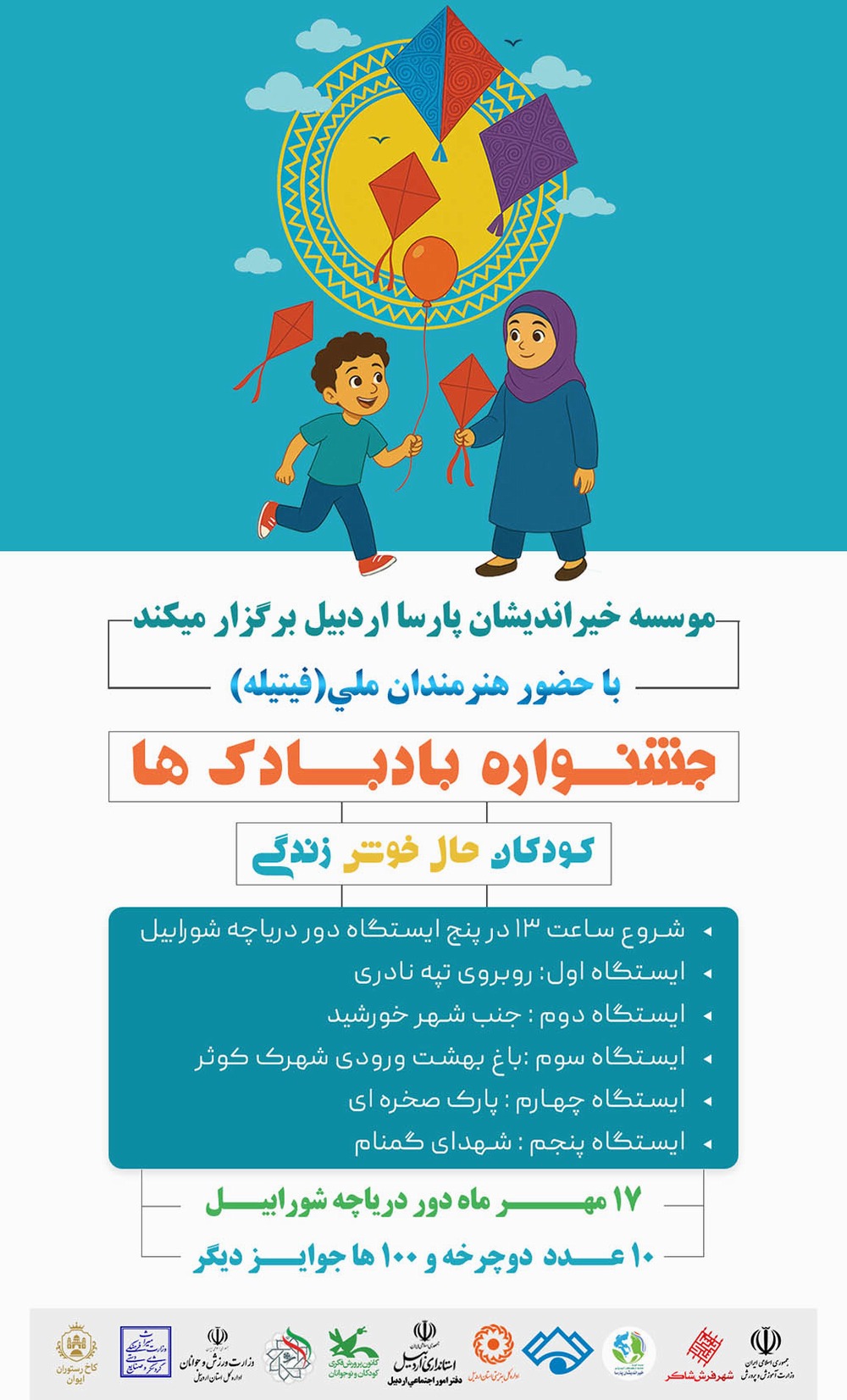 وی هدف از برگزاری این برنامه را فراهم‌سازی زمینه حضور خانواده‌ها در فعالیت‌های فرهنگی و ایجاد فضایی شاد و پویا برای کودکان عنوان کرد و افزود: این جشنواره از ساعت ۱۳ در پنج ایستگاه اطراف دریاچه شامل ایستگاه اول روبه‌روی تپه نادری، ایستگاه دوم جنب شهر خورشید، ایستگاه سوم باغ بهشت ورودی شهرک کوثر، ایستگاه چهارم پارک صخره‌ای و ایستگاه پنجم شهدای گمنام آغاز می‌شود.